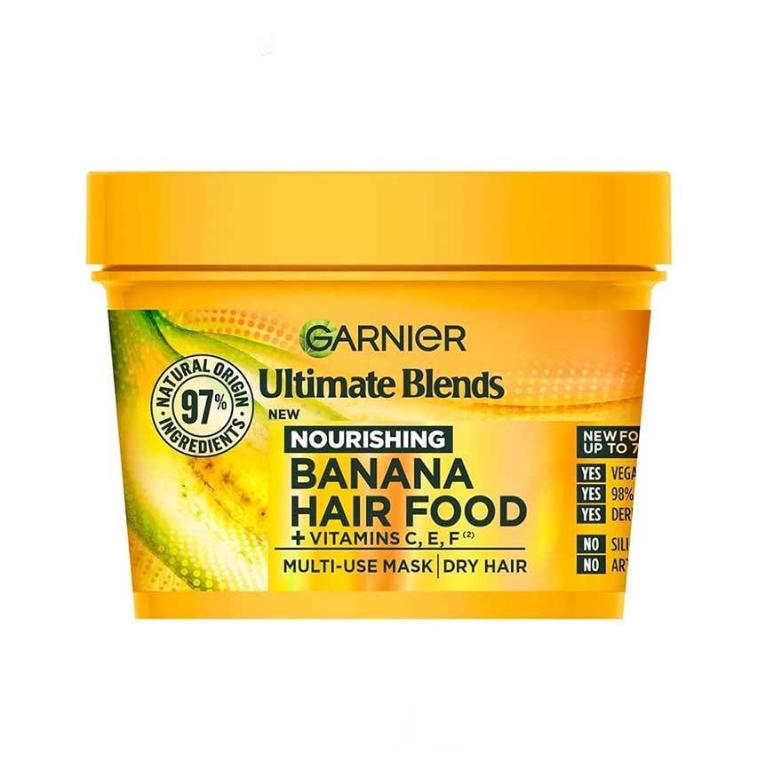 موز سرشار از ویتامین B6، ویتامین C، پتاسیم و قندهای طبیعی است که باعث مرطوب‌سازی عمیق موها می‌شود. این میوه پرخاصیت همچنین به تقویت بافت مو، جلوگیری از شکنندگی، افزایش درخشندگی طبیعی و رفع موخوره کمک می‌کند. برند گارنیر با بهره‌گیری از این خواص، ماسکی طراحی کرده که علاوه‌بر آبرسانی، به بازسازی و احیای موها نیز کمک می‌کند.